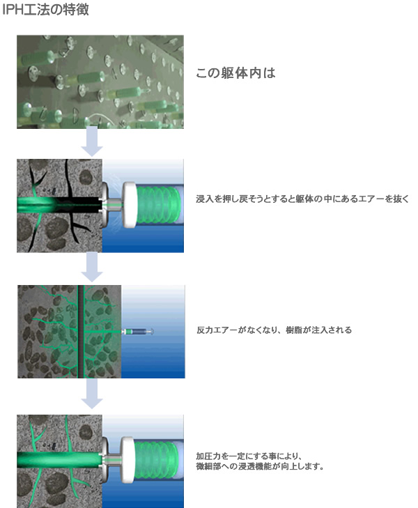 しかしながら、この注入は雨水を建物に入れない為の注入で、コンクリート内部構造にま では達しないものであります。IPH工法は、「強度復元力」を達成する機能に完成しました。本工法では穿孔穴の内部から注入された樹脂がコンクリート躯体 内で放射状に拡散することにより、末端の微細クラックまで充填することができます。
